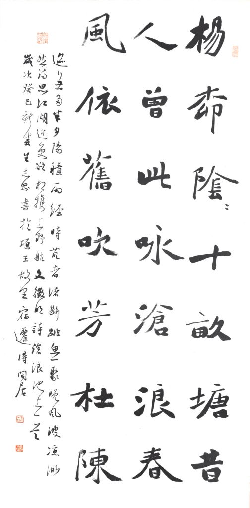 朱志刚近期创作的另一个特点在于对字型空间感的营造上。我们分析他的作品,能体会到他在单字结构上的独具匠心。通过对结字的非常规化营造,使字型的空间感得以加强,我想这正是他深植传统的体现。他认为书法首先要遵守传统。学古,也就是临摹,这是毫无疑问的。但不能机械临古,不可荒率。必须选择自己喜欢的,同时也经得起历史推敲的经典碑帖。并略加自己的想法。变则通,通则久。万万不可千篇一律,有古无我。只有不断地在古人身上讨消息,才能把基础打牢,将来才会挥洒出高质量的线条。书法需要创新,但书法的创新不是盲目的,是在继承传统的基础上创新。要有意不刻意,遵守不保守,大胆不妄为。另外,书法从古至今,每个时代都具有各自的时代风貌,现在也是如此。现在的书法多用于展览,我们创作作品时需要考虑展厅效应。让继承与创新的关系在冲突中融汇,才能创作出与时俱进的精品力作。
