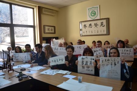 李玉刚计划为成人班学习者们上一堂书法课,教授他们书写“家和万事兴”,于晓光则准备给儿童班可爱的小朋友们教唱中文儿歌“小星星”。等待已久的孔院学生在两位新老师走进教室的一刻起身热烈鼓掌欢迎,他们用刚学的汉语齐声说:“欢迎你来罗马尼亚”!两位艺术家非常感动。课堂上两位“明星老师”声情并茂地向罗马尼亚学生教授了中国的语言和文化,出色地完成了孔院的教学任务,获得了学生的一致好评。(图4、5)书法课下课前,学生们展示了自己的书法作品“家和万事兴”,在中国传统佳节之日,这样的教学内容有着特别重要的的文化内涵和价值意义(图6)。