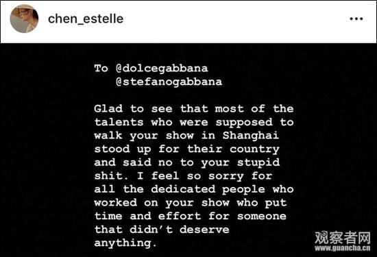 在Instagram上,曾经两次参加维密走秀的法国华裔模特陈瑜(Estelle Wong)发了一篇长文,表示D&G的这一行为是“无礼和种族主义的”。
