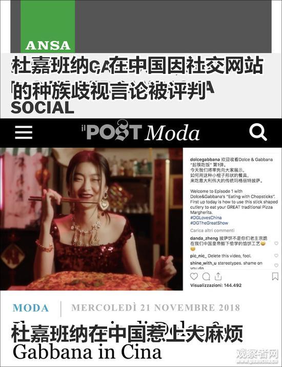 意大利最大的通讯社安莎社和意大利线上日报il Post均在报道中表示,D&G在这次的辱华事件中,涉嫌存在种族歧视和性别歧视。