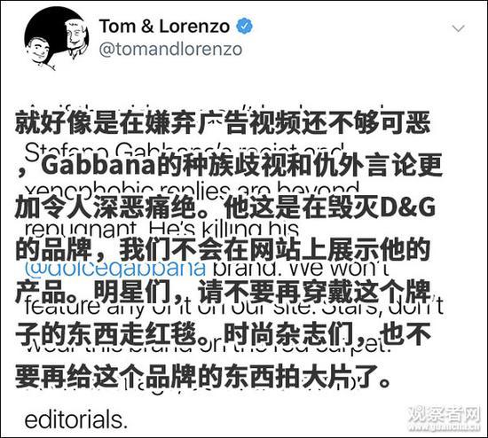 不过大部分外媒把报道重点都放在了三则争议广告上,对于真正激怒中国人的导火索——D&G品牌创始人兼设计师Stefano Gabbana辱华聊天记录”却一笔带过,只说对方发表了不当言论,具体说了什么激怒中国人,没有详细阐述。