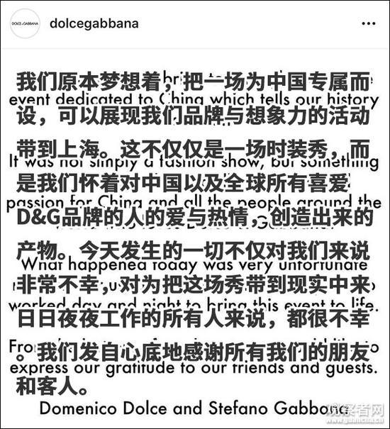 21日晚,D&G在社交媒体Instagram上宣称对中国“怀有爱与热情”,发生这一切非常不幸,但通篇并未提及“道歉”一事。