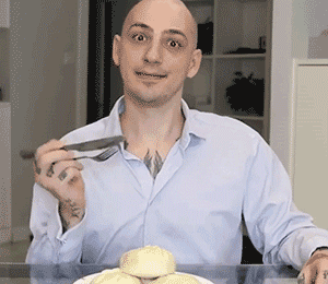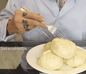 尝试了多次男子都没能夹起包子,在旁白的指引下,他用餐刀插进包子,终于成功吃上了一口,兴奋地捂上“娇羞”小嘴。